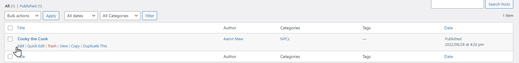 Once published or saved you can click the “All (Post Name)” to see your post in the list of posts. If you hover over a post, a menu will come appear. Use it to edit, quick edit, trash, copy, or duplicate the post.