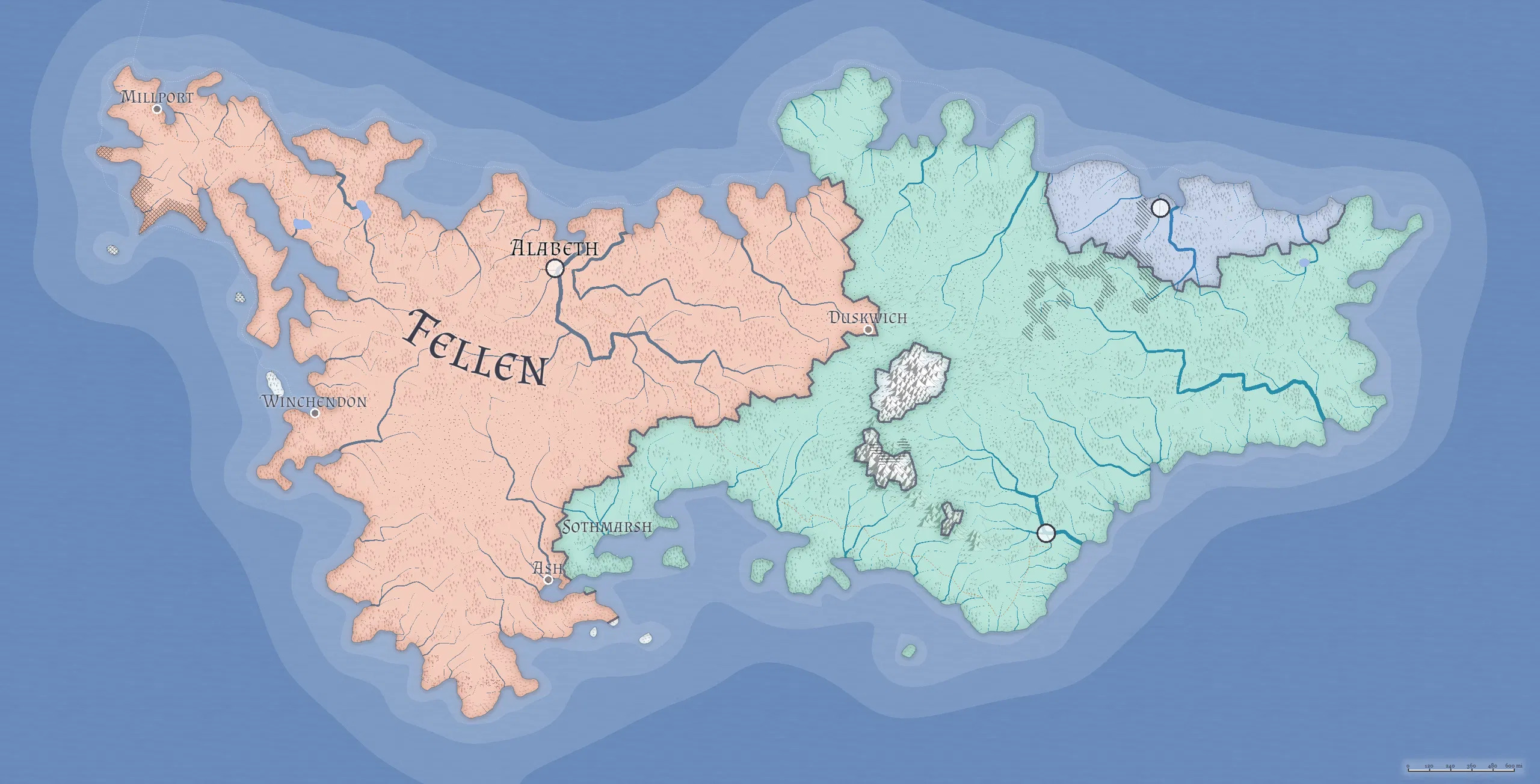 The country of Fellen is one of three nations of the known world. The river city of Alabeth serves as the kingdom seat and largest of the major cities. At the south end of the country is the port city of Ash. West of the capital is the port city of Winchendon, and north from there the port city of Millport. See its right there in the name.