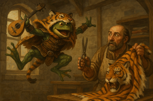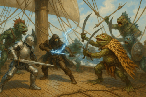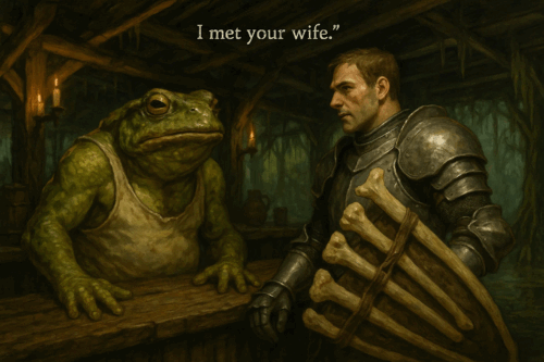 An old bullywog knight come up. What are you doing here? Captain? Sir, this is the duke’s son. Lux and Jartha do an acapella version of duke of earl.