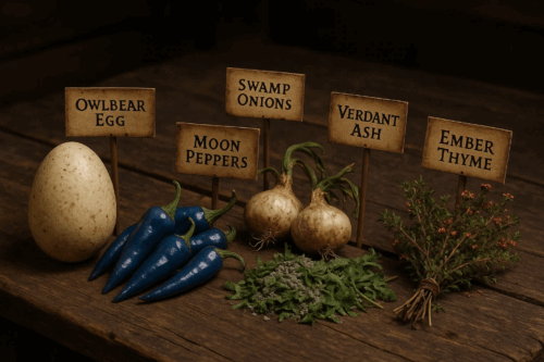Cooks is like he needs to focus on the ultimate after dinner omelete and needs special ingredients. Wants to hit the high while he’s still young. Also he’s a gnome. Kex is like how old are you? 212. 12? 212! Says we need eggs. Gotta be from a big creature – big creatures, phoenix, dragon, griffin, spider. Also needs moon peppers – found only at night – not sure where they’re found. We need the most powerful ingreidents for the most powerful omelet. We need swamp onions. We need emberthyme. Also needs verdant ash – special tree that’s burning to the ground. This recipe was taught to me years ago. I didn’t think you were up to date. He learned the recipe from saucebeard glimmerspoon! Kex somehow knows him. Taught cooks everything he knows – including frying pan attacks.