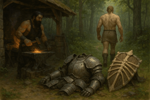 Kex approaches the blacksmith. “Name’s Holliday, I can assist you in any smithing needs”. Jartha asks about polishing, Holliday is like leave the shield and the armor and I’ll take care of it. He can tell the bones are dehydrated. He has such implements to upgrade equipment. Jartha gives him the oil, he’s excited about using.