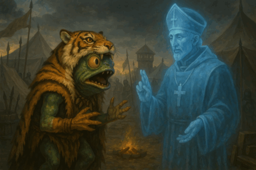 We huddle and discuss. Kex calls THE PRELATE! Kex asks about WhisperBranch – says he knows the Vicar. Is devout and pure, good guy. Knows him to be a standup guy. Kex asks where the Prelate is. Prelate is in Ash, are many of those that used to live in Alibeth. Asks about what danger would exist if Jaree were to pass soon. Prelate says you are describing The Great Worry. We wonder, but do not know. We are faithful that his death will not be terribly disruptive. We ask about the world dragon, we have not answers. Stopping Hawkwind, Cleo Pipe seem to be the only things we can do. Says no one has Cleo Pipe in year, Vario is up here very often. Commands the Ash Born – Vario is a very powerful creature.  Only the most powerful of magic users could disguise themselves as an imp. Perhaps a wizards, lytch, ancient dragon. Says he trusts lord Oakley and Lord Athenish implicitly.
