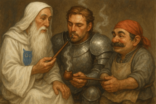 Lux says we have conquered dimensions, we are friends with Jaree (put off by the mistreatment, speaks of their deeds and brandishes the owl figurine). The Wizard, Allerian the Wise identifies himself and is suspicious of us. Not impressed by the figurine, but interested in Cleo Pipe’s pipe, Jartha smoke him out. This is some good shit. I believe you – you must be the triumvirate that has passed through the portal. Please accompany us to Lord Oakley’s camp.