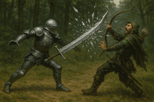 Lux takes a spot on the ridge, kex and jartha head towards the bush in question.  We fight archer – Jartha throws the huge sword for some damage. The sword hilt shatters into a million pieces.  (Ed note – AI and I disagree how big a giant 60′ sword is…)