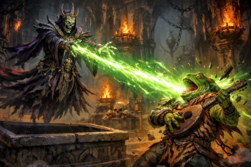 Cooks gets a few hits in, as does Jartha. Lux, who can be seen by the Litch, is power word frightened, Jartha is stunned. Lassard casts mending so that Jartha’s clothes look better. Then he roles a 1 so his sword is destroyed.