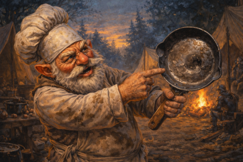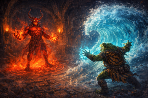 Jartha uses indomitable spirit. We keep fighting. COOKS DROPS HIS FRYING PAN INTO THE POOL OF POISON. Jartha shoves one of the mages into the pool. “That’s what you get for burning my friend”. We win the battle. Kex uses mage hand to try to get the pan. Only the wood handle survives. Cooks needs better steel. We hear scuffling and movement to the north.